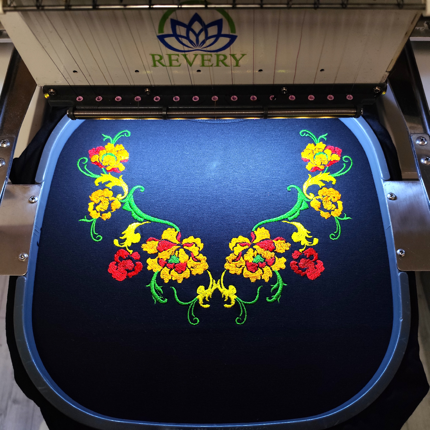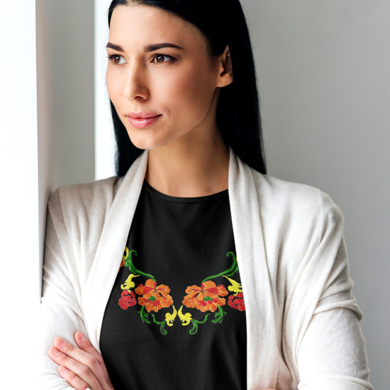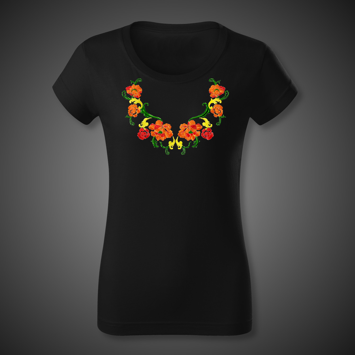 Nádherný kvetový ornament, tvarom a farebnosťou zdôrazňujúci hlbší okrúhly výstrih. Vyšívané v našej dielni.